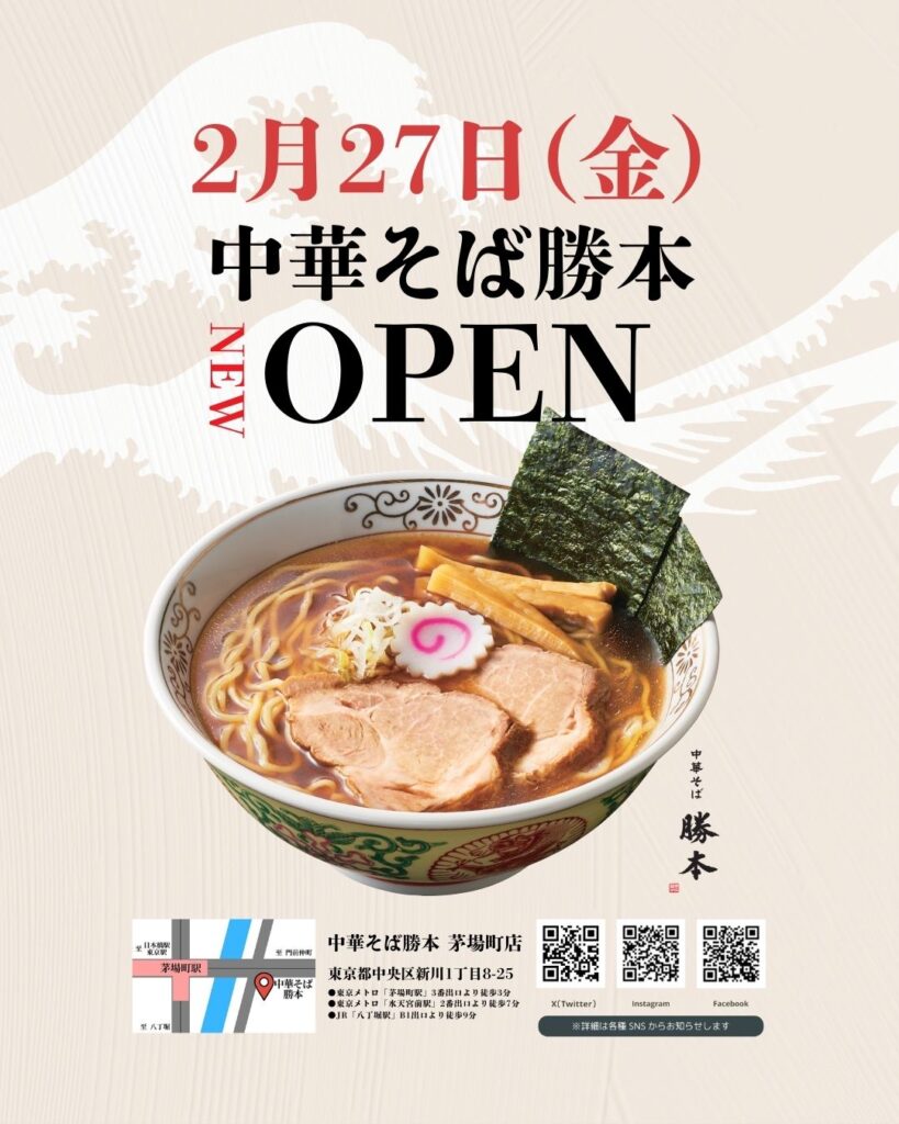 東京⽔道橋に本店を構える「中華そば勝本」(東京都千代田区・店主松村康史)は新店「中華そば勝本 茅場町店」を、2026年2月にオープンいたします。