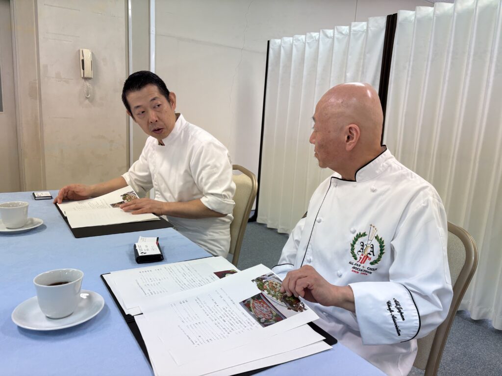 まずは実習が始まる前に手順やスケジュールの打ち合わせをします。今回は引継ぎを兼ねた教務ということもあり、いつも以上に念入りにレシピや作業の流れを奥田シェフと確認しました。