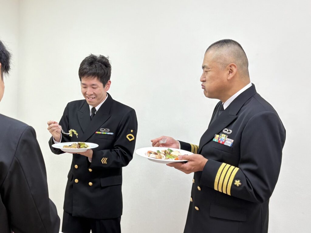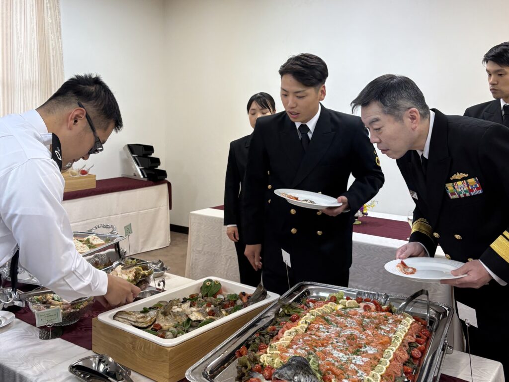 海上自衛隊の給食は、業務負担や食中毒リスクに配慮した大量調理を行うため、本格的に1から調理をする機会はほとんどありません。そのため、隊員にとってプロの料理人から直接学べる実習は、レシピだけでは得ることのできない知識や高度な技術を習得できる貴重な機会になっています。そしてそれはレセプション時だけでなく、給食調理時に応用して活かされている場面もあります。