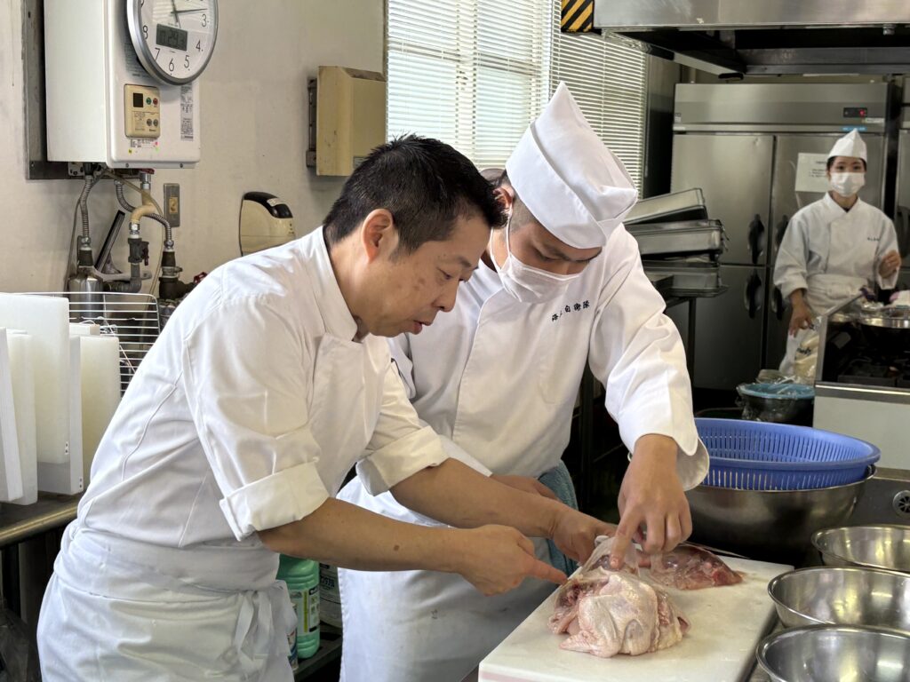 (丸鶏のさばき方を教える奥田シェフ㊧と、丁寧に確認を重ねる隊員㊨)