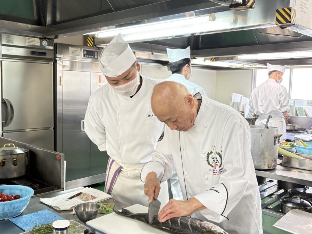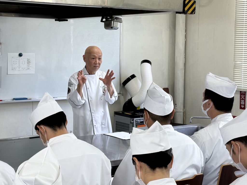 松村がラーメン屋に転身する前は、約36年の間にわたり京都でフレンチシェフとして活躍しており、その頃から約17年間にわたって同校で西洋料理の外部講師を務めてきました。しかし、この度講師を引退することを決意し、今回が最後の教務となりました。今後は京都「Bistro OKUDA」のシェフであり、京都調理師専門学校での教務経験も持つ奥田茂一シェフにその役を引き継ぎます。